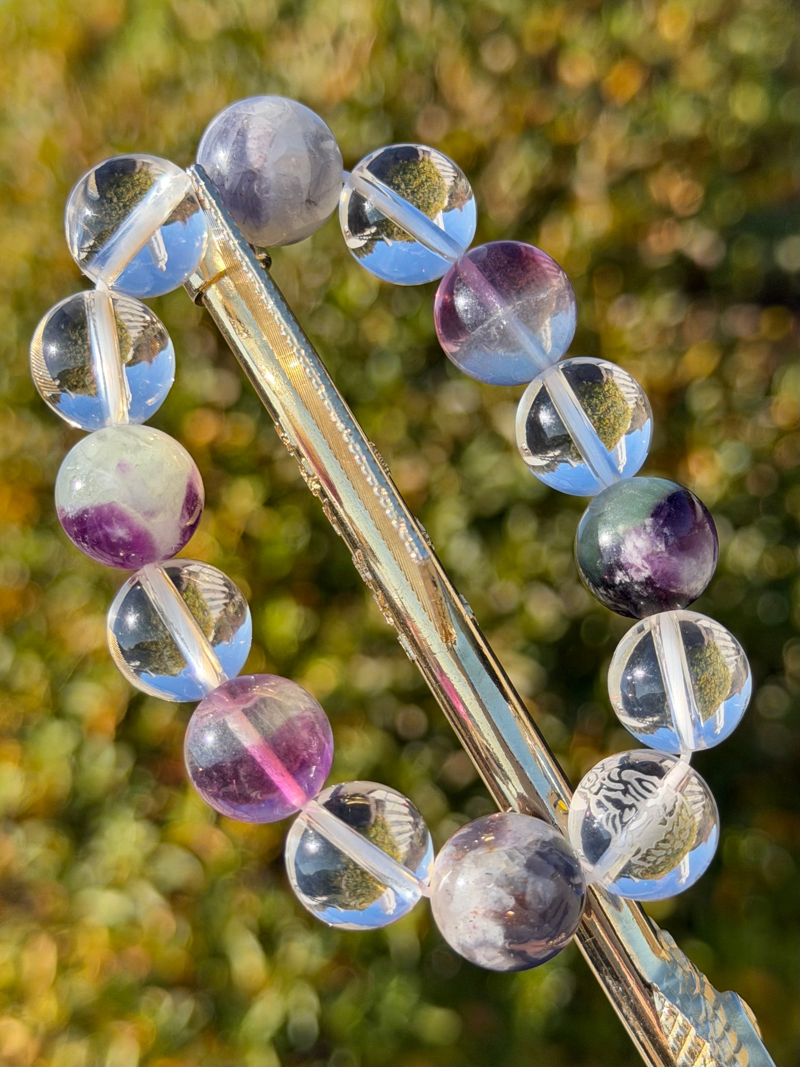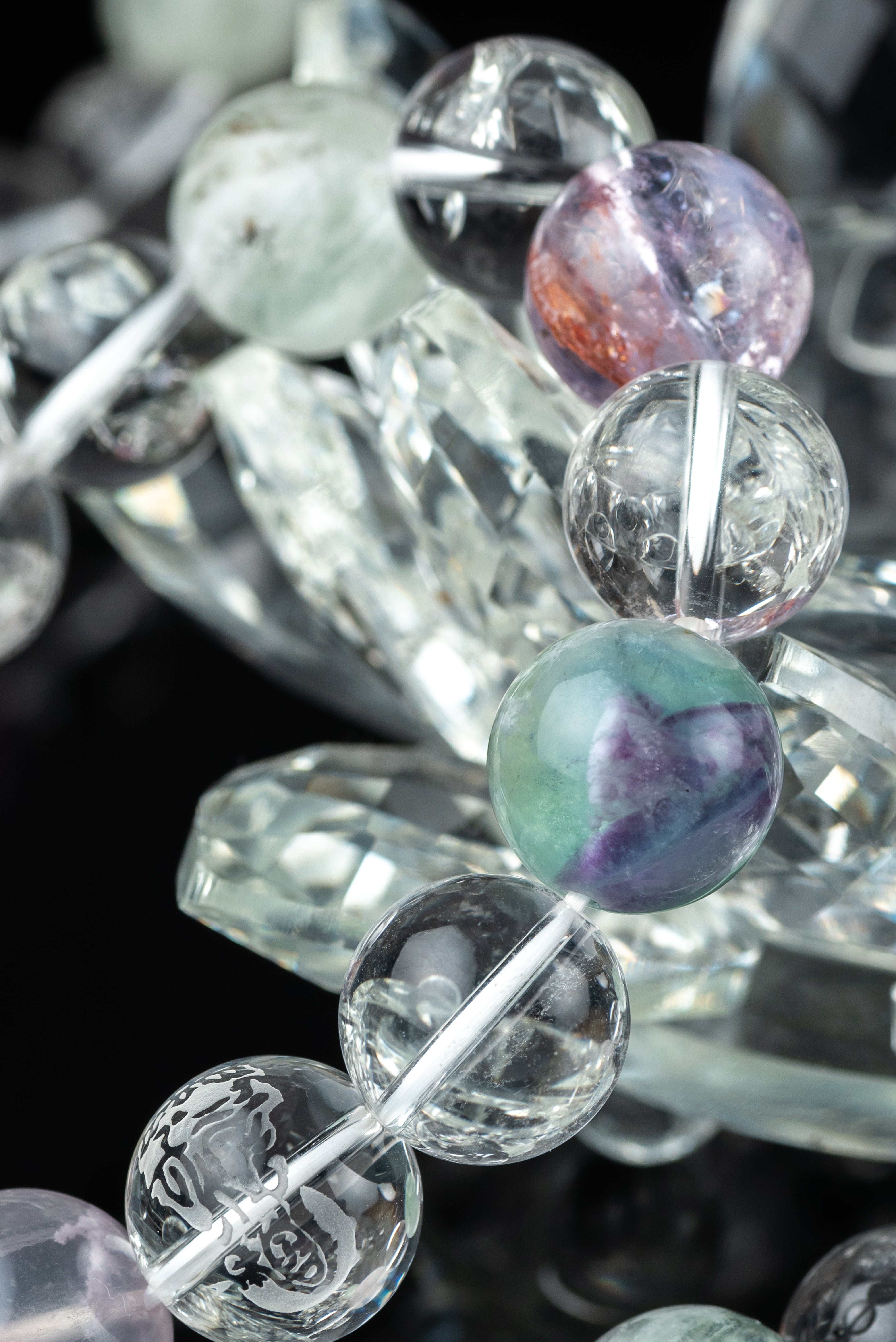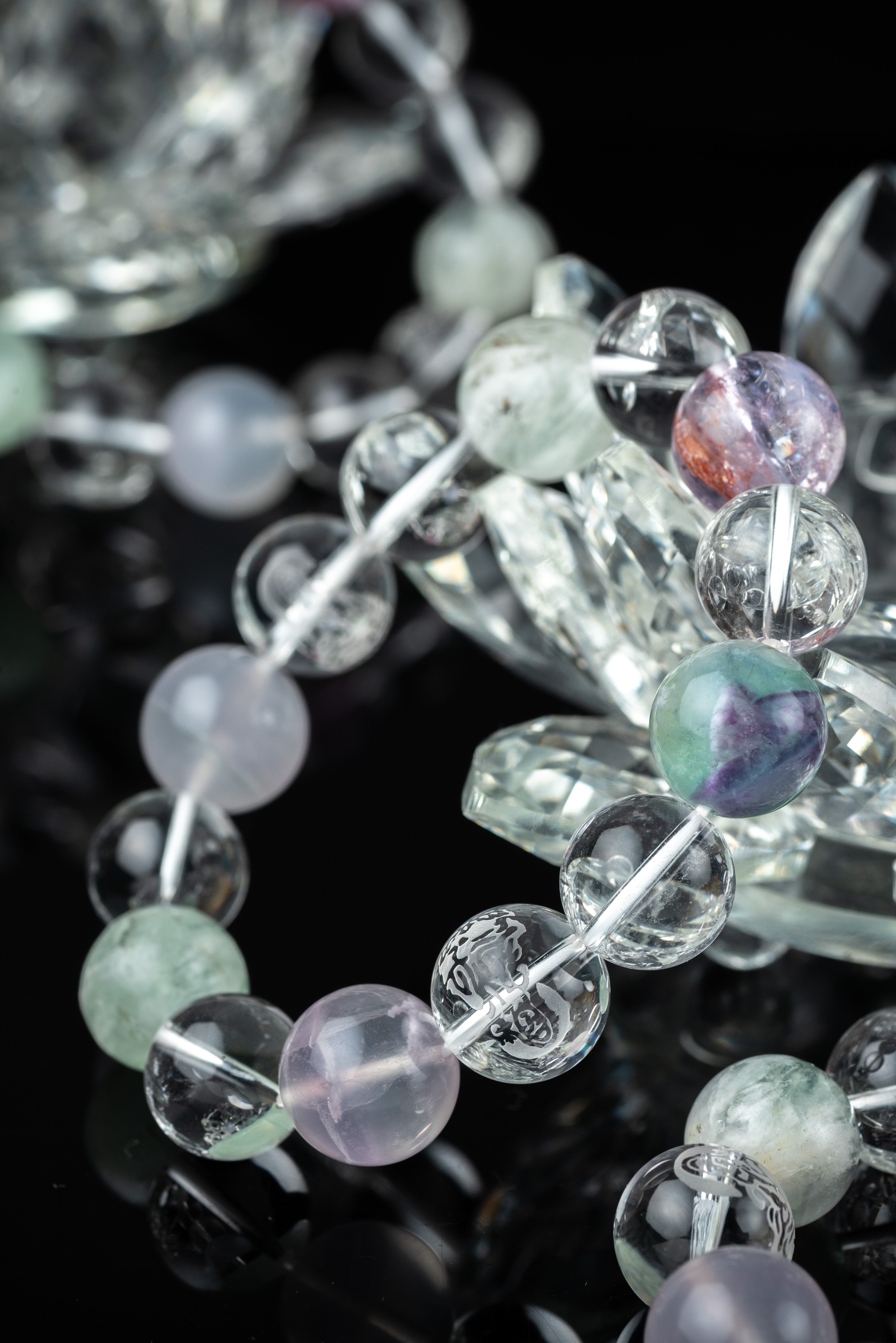 ・使用石:ブライトショットアオライト/フェザーインフローライト/バイカラーフローライト/観音(素彫り水晶)/天然水晶